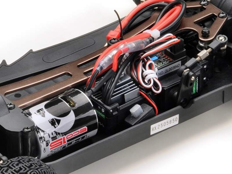Das Auto wird von einem 540er 15T Bürstenmotor befeuert, der direkt auf den Allradantrieb zugreift. Die beiden Differentiale (vorne und hinten) werden durch eine Aluminium-Antriebswelle angetrieben. Durch die höhere Leistung des Fahrtenreglers und den Einsatz von T-Steckern kann jeder 2S LiPo-Akku verwendet werden – egal, welche C-Rate und Kapazität