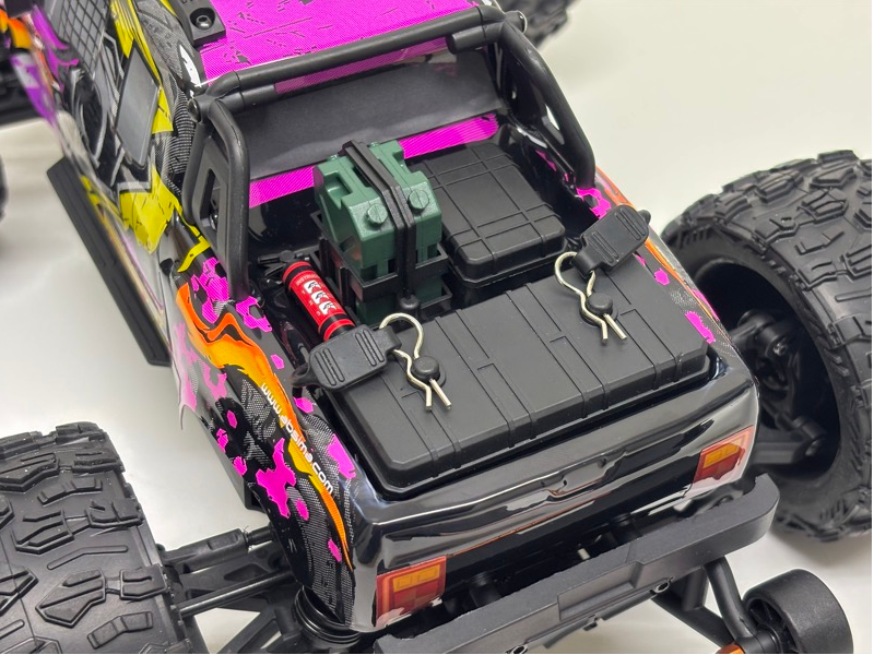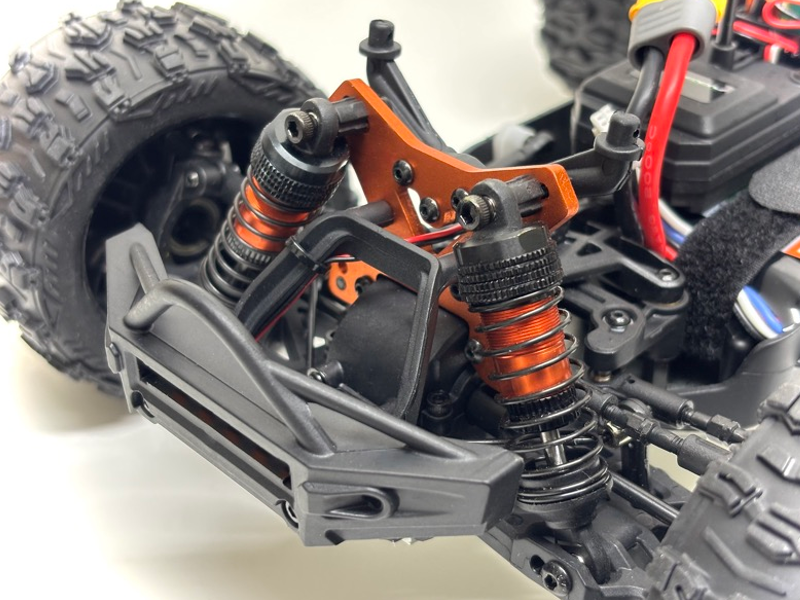 Die Karosserie im Race-Design ist ein echter Eye-Catcher! Dazu kommen etliche Anbauteile wie Außenspiegel, Überrollbügel, Front-Grill und einiges an Accessoires auf der Ladefläche. Dazu kommt die richtig coole „gelb leuchtende“ LED-Frontbeleuchtung. Mit all seinen orange eloxierten Aluminium-Chassis Teilen wie Dämpferbrücken, Stoßdämpfern, Motor usw. ist dieses Off-road Monster unfassbar hochwertig ausgestattet.