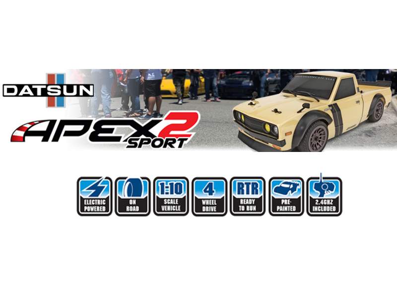 Der Associated Apex2 Sport Datsun 620 Truck ist ein hochdetailliertes und spielerisch zu fahrendes Ready-to-Run RC-Car. Der Datsun 620 wurde auf einem budgetfreundlichen Apex2 Sport Chassis aufgebaut und verfügt über einige der neuesten Features im Rennsport. Die vordere und hintere Einzelradaufhängung mit Spiralfederung und aktiver Hinterradspur verleihen dem Apex2 Sport das ultimative Handling auf unebenem Asphalt. Das macht ihn zu einer perfekten Plattform für den Datsun 620 im Maßstab 1:10!