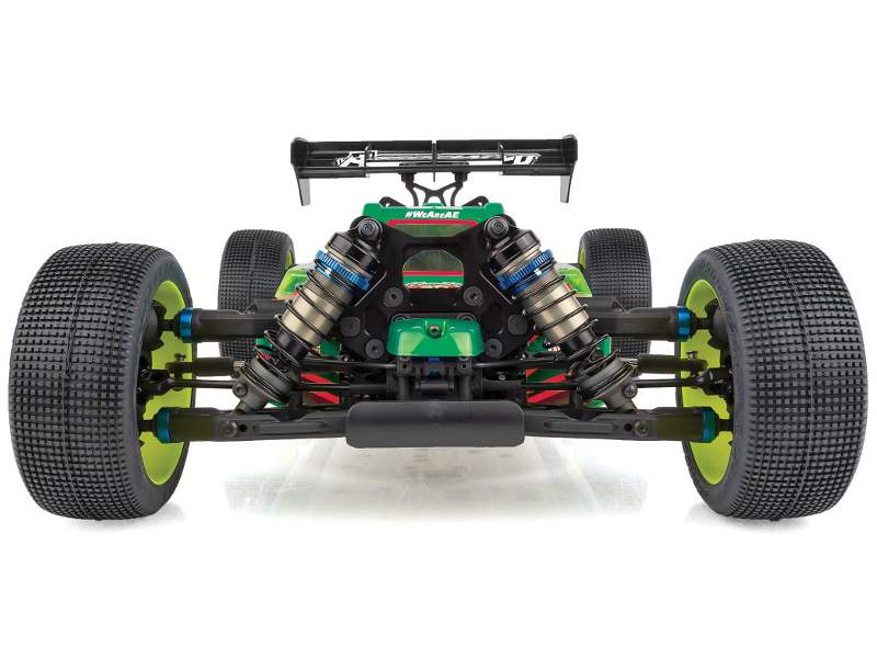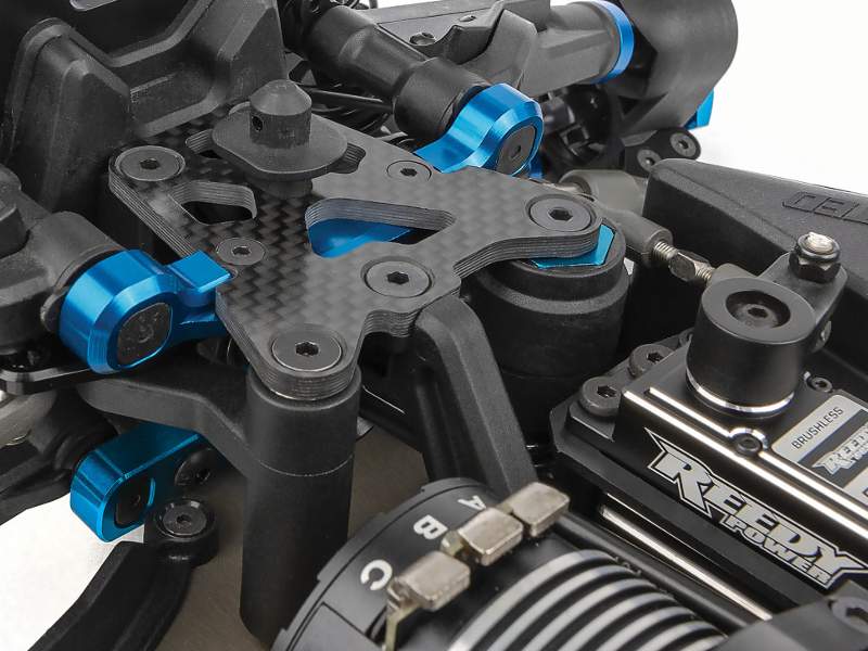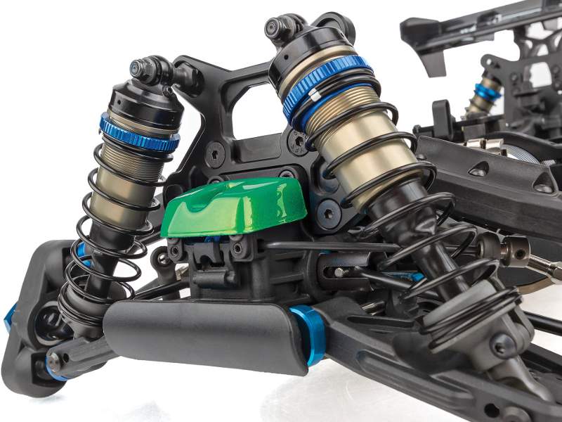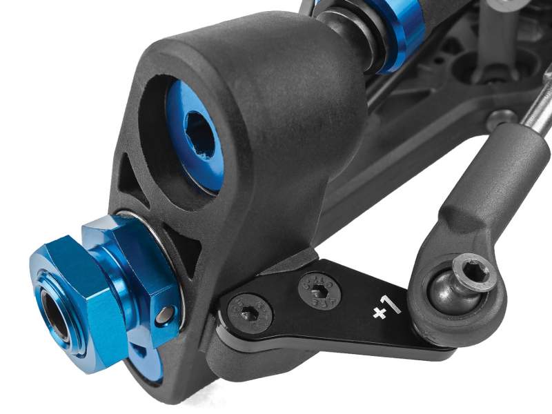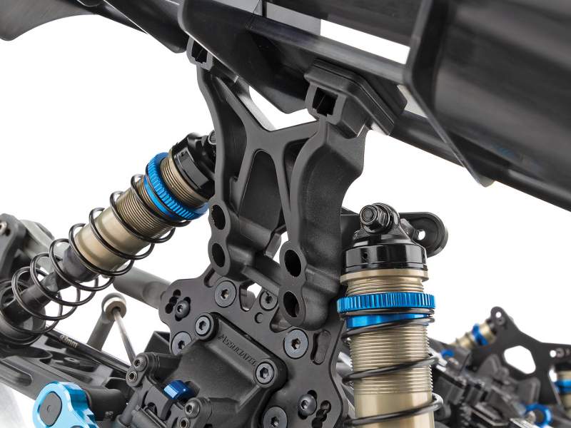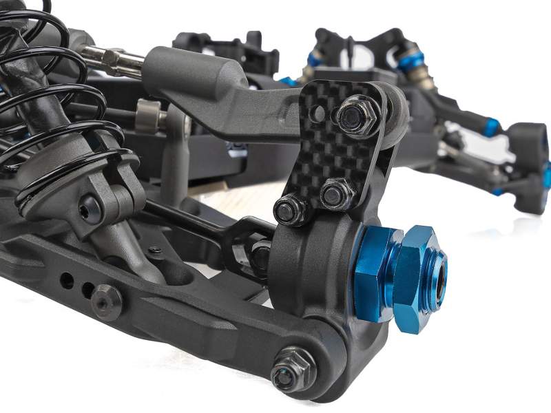 Die Aufhängung wurde mit neuen Low-CG-Dämpferbrücken vorne und hinten und kürzeren Stoßdämpfern sowie neuen hinteren Querlenkern mit drei Bohrungen für die Einstellung der Geometrie überarbeitet, die weichere Stoßdämpfer und Federn ermöglichen, ohne die Stabilität in schnellen Kurven zu beeinträchtigen.Die neuen hinteren Radträger mit breiter Basis gibt es in drei festen Achshöhen und mit 3 mm dicken Kohlefaserplatten, um verschiedene Geometrieoptionen zu ermöglichen.