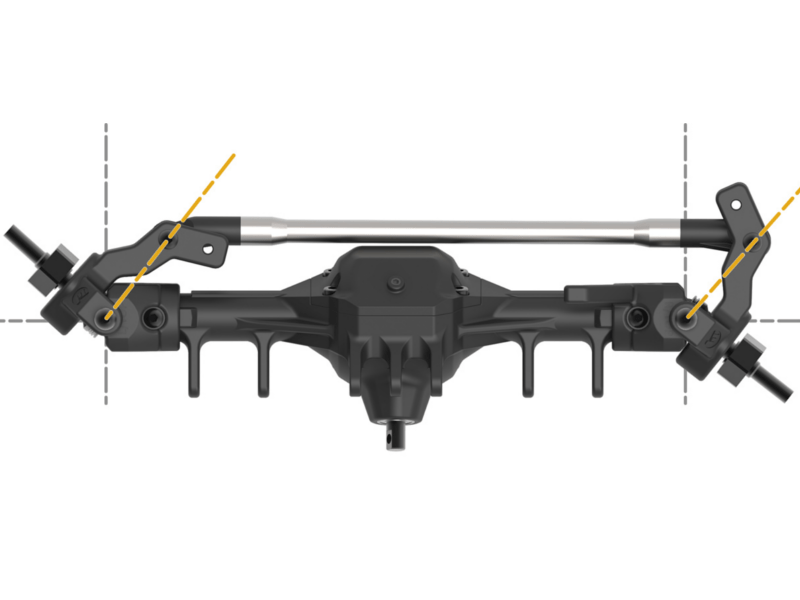Die neuen Achsschenkel sowie die neuen CVD-Kardans ermöglichen einen Ackermann von 0°. Bei Kurvenfahrten bleiben die Räder parallel, was den Lenkwinkel verbessert - PANHARD-Unterstützung (Optional)