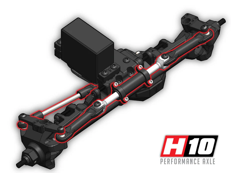 Der Hyrdo-Ram ersetzt eine traditionelle Spurstange und das Lenkservo ist hinter der Achse versteckt. Alle neuen H10-Achsschenkel ermöglichen es, dass der Achsschenkel geschützt und außer Sichtweite ist. Die Hyrdo-Vorderachse umfasst VDI-Kardanwellen für 47° Lenkeinschlag. - Integrierte Steering Skid Plate