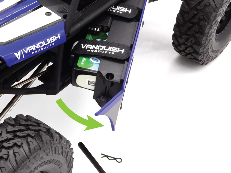 Die Gesamthöhe des Fahrzeugs (mit 4,75″ Bereifung) beträgt 7,80″ (198 mm). - Akkufach und -befestigung