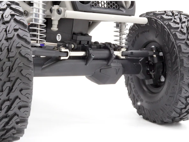 Die neu entwickelten H10 Achsen bieten eine größere Breite als die bekannten F10 Achsen und integrieren eine Scale-Hydrauliklenkung im Hydro-Ram-Stil. Diese innovative Lenkung simuliert einen echten Hydraulikzylinder („Ram“): Das Lenkservo ist geschickt hinter der Vorderachse versteckt und steuert die Räder indirekt an. Beim Einfedern taucht das Servo in das Chassis ein – für maximale Scale-Optik ohne sichtbare Lenkstangen und optimalen Schutz bei harten Geländefahrten. - 4-Link-Aufhängung mit achsmontiertem Lenkservo