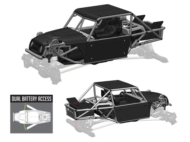 Das Design des H10 Chassis ist von Trail Buggys abgeleitet, die gebaut wurden, um das härteste Terrain der Welt mit Komfort und Stil zu bewältigen. Das symmetrische Design mit 2 Sitzen sorgt für eine geringe Gesamtbreite, die das Umfahren von Hindernissen erleichtert. Kurze vordere und hintere Überhänge optimieren das An- und Abfahren, so dass die Reifen die Hindernisse zuerst erreichen.
