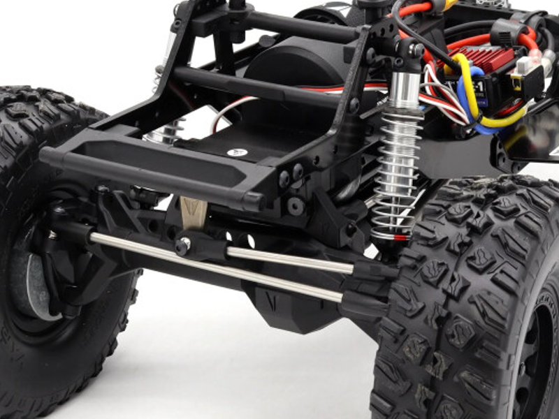 Die Incision S8E Stoßdämpfer bieten feinfühlige Dämpfung bei gleichzeitig hoher Belastbarkeit. Edelstahl-Lenkstangen mit Incision M4 Kugelpfannen verbinden das Chassis mit den Achsen. Die hinteren unteren Links sind gebogen und bieten maximale Bodenfreiheit. Mehrere Stoßdämpferpositionen ermöglichen die Feinabstimmung der Fahrhöhe und des Breakover-Winkels. -