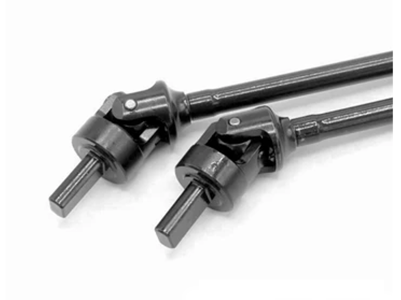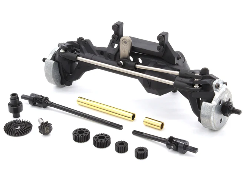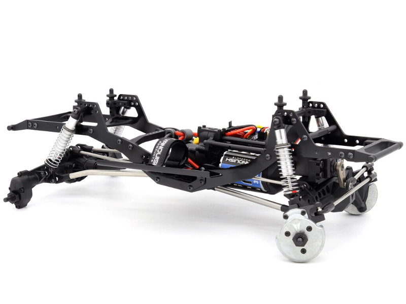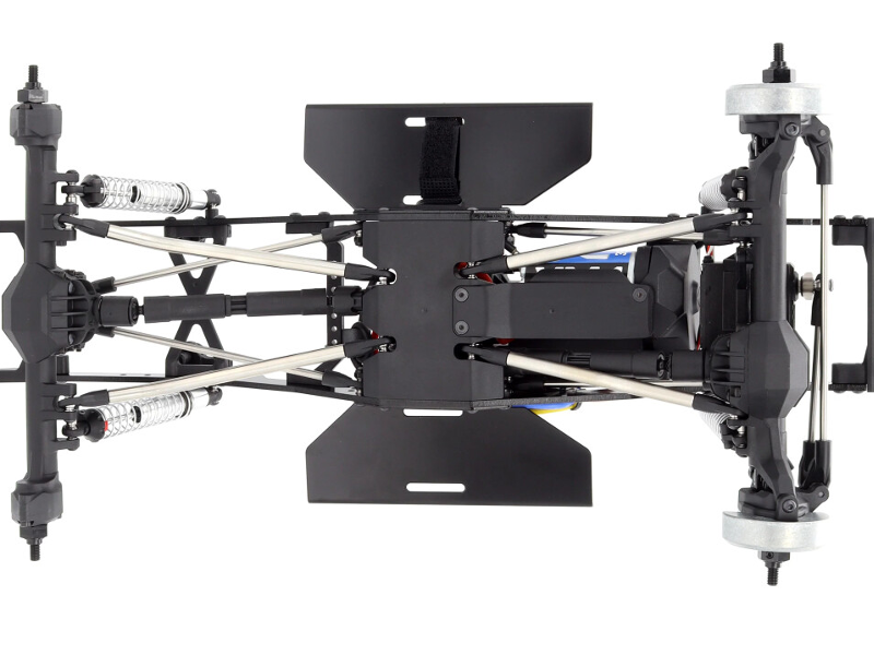 Das Herzstück des Chassis bilden gestanzte Aluminiumrahmenholme, kombiniert mit einer 6° flachen Skid-Platte und dem tief im Fahrzeug positionierten VFD-Getriebe. Durch die gespritzten Chassis-Komponenten wird der Schwerpunkt besonders niedrig gehalten und durch die F10 Portalachsen wird die Bodenfreiheit maximiert. Die Vorderachse verfügt über ein Servo-on-Axle Layout mit 4-Link Aufhängung. Beide Achsen sind zusätzlich mit Messinggewichten in den Achsrohren sowie vorderen Alu-Lenkhebel-Gewichten ausgestattet – für optimale Gewichtsverteilung und Fahrstabilität.