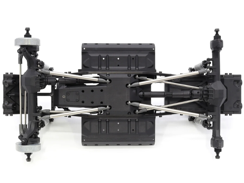Die Konstruktion basiert auf einem robusten C-Profil-Rahmen aus Stahl mit durchdacht positionierten Befestigungspunkten für Elektronik, Akku und Karosserie. Die modulare Gestaltung erlaubt eine flexible Anpassung an individuelle Bedürfnisse und Umbauten. Mit dabei sind hochwertige Incision Stoßdämpfer mit harteloxierten Aluminiumgehäusen sowie präzise ISD10 Antriebswellen. Das integrierte VFD Twin Getriebe bietet nicht nur einen wählbaren Overdrive von 6,5 % oder 46 %, sondern auch eine zuschaltbare Dig-Funktion, mit der die Hinterachse im Crawl-Modus abgeschaltet werden kann – perfekt für enge Manöver.
