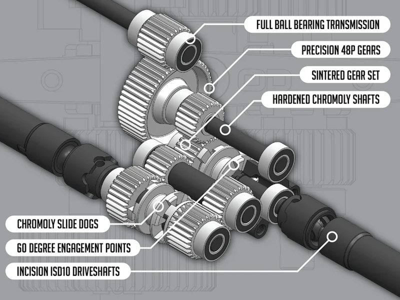 Das VFD-Doppelgetriebe bietet einen stufenlos schaltbaren Overdrive (6,5 % oder 46 %) und einen 3-stufigen Dig. Es ist auf Langlebigkeit ausgelegt und verfügt über bearbeitete Innenzahnräder und Chromoly-Wellen für eine gleichmäßige und zuverlässige Kraftübertragung. Die bearbeitete Motorplatte, Lagerplatten und Stützen sorgen für maximale Festigkeit und Stabilität unter Last. - Antriebsstrang